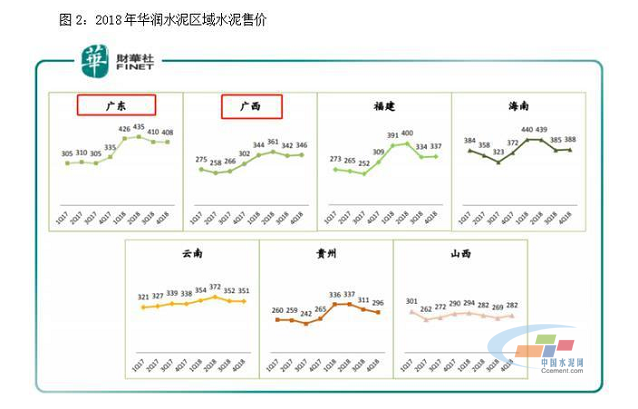 從直觀的角度上看,公司營業(yè)收入增速明顯弱于歸屬股東凈利潤年復(fù)合增速,這主要受期間內(nèi)公司增強(qiáng)了對成本管控(運(yùn)營管理、采購管理及物流管理)及水泥價(jià)格上漲所致。特別是2018年,公司的歸屬股東凈利潤是上市至今表現(xiàn)最佳的一年。其中最大影響因素莫過于兩廣水泥價(jià)格維持高位,且價(jià)格普遍高于國內(nèi)其他地區(qū)(如下圖2所示)。