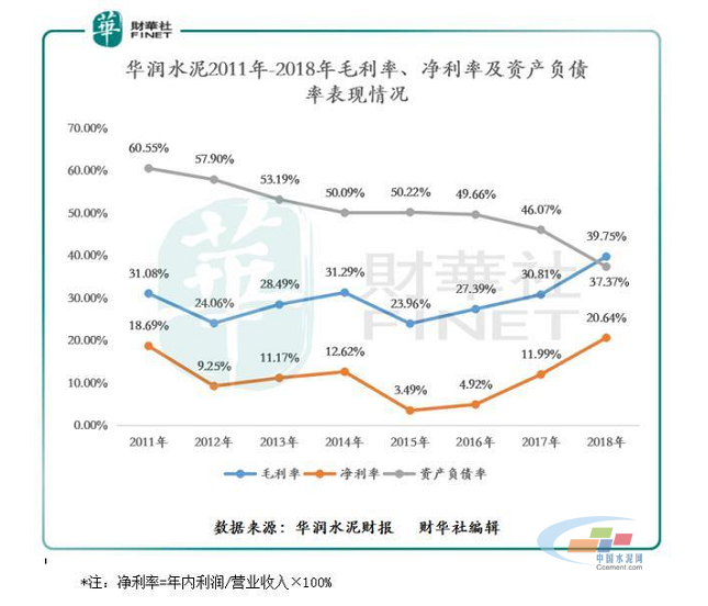 截至2018年底,公司毛利率從2011年的31.08%增至2018年的39.75%。其中毛利率從2015年低點(diǎn)的23.96%增長15.79個(gè)百分點(diǎn)至2018年的39.75%,主要是受期間內(nèi)公司增強(qiáng)成本、資本開支的管控,同時(shí)期間內(nèi)水泥價(jià)格走高等因素影響,推動公司毛利率從2015年的53.76億元增至2018年的135.11億元,年復(fù)合增速高達(dá)35.95%。