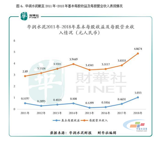 凈利率的增長也推動了公司基本每股收益及每股營收入持續(xù)走強(qiáng)(圖4)。截至2018年底,華潤水泥的基本每股收益從2011年的0.519元增至2018年的1.033元,同期每股營業(yè)收入從2.89元增至4.867元。